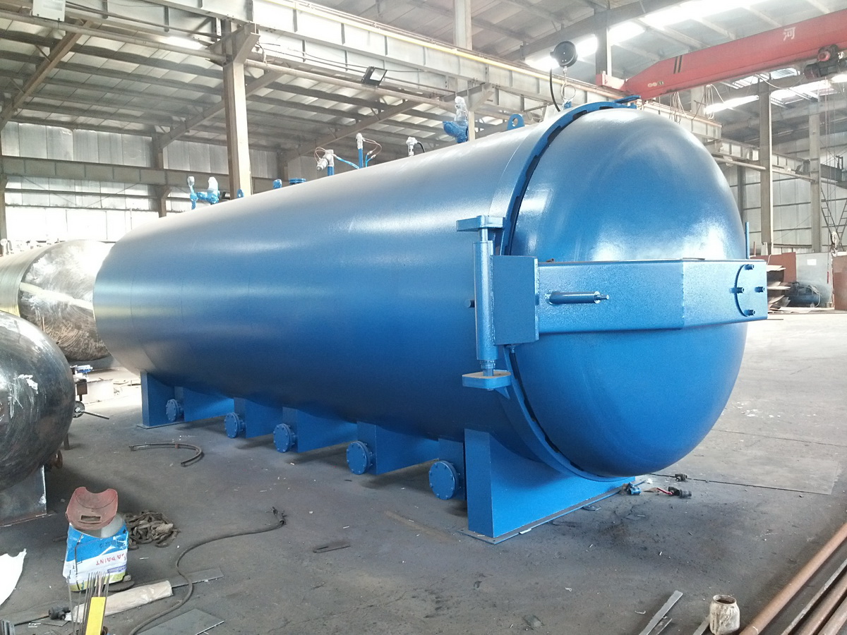 主要工作原理:采用幾組特制的不銹鋼散熱管分布在罐壁控制加熱。蒸汽由罐后2組自動閥門進入到罐內的散熱片中,散熱管按規則排列在罐體的上下左右方,高溫風機通過溫度循環板將熱量由后至前均勻分散,熱量推進至罐門后返回風機導流罩處,循環風道促使罐內熱量更均勻的循環和擴散,優化熱循環和熱傳導效率,熱量在罐內來回循環,形成均勻的溫度場,溫度均勻無死角,壓力恒定。解決了罐內產品因溫度和壓力不均勻,而造成產品質量的差異,設定工作程序后,控制系統自動進行升溫、保溫、硫化等工作,硫化結束后自動斷電并發出聲光報警音提示。采用這兩種加熱方式,都需要額外配備鍋爐,產生蒸汽硫化。
