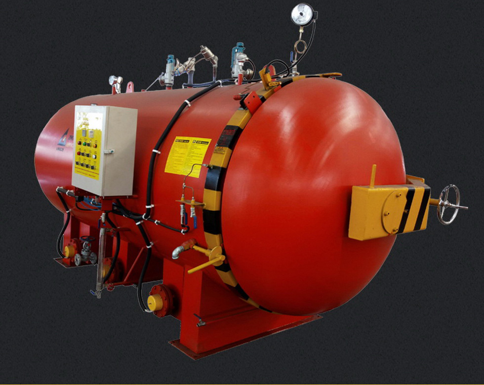 主要工作原理:采用幾組特制的不銹鋼散熱管分布在罐壁控制加熱。蒸汽由罐后2組自動閥門進入到罐內的散熱片中,散熱管按規則排列在罐體的上下左右方,高溫風機通過溫度循環板將熱量由后至前均勻分散,熱量推進至罐門后返回風機導流罩處,循環風道促使罐內熱量更均勻的循環和擴散,優化熱循環和熱傳導效率,熱量在罐內來回循環,形成均勻的溫度場,溫度均勻無死角,壓力恒定。解決了罐內產品因溫度和壓力不均勻,而造成產品質量的差異,設定工作程序后,控制系統自動進行升溫、保溫、硫化等工作,硫化結束后自動斷電并發出聲光報警音提示。采用這兩種加熱方式,都需要額外配備鍋爐,產生蒸汽硫化。